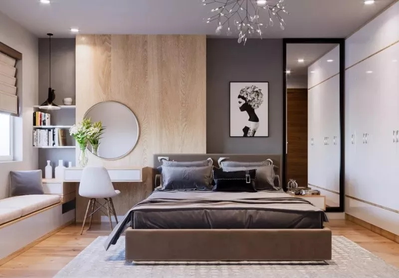 其實,臥室可以省略一個床頭柜。在床頭位置設計一款小書桌,既能辦公,還可以當梳妝臺使用。450mm以上的進深,就能將手臂放到桌面來操作電腦,桌下放腿的空間也足夠寬敞。