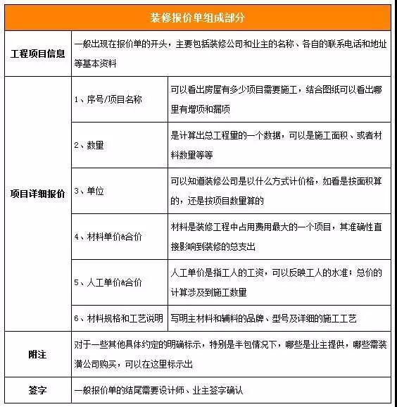 1)看施工項目是否全面,是否漏掉防水、頂面膩子或其他必要項目,避免后期業(yè)主迫于無奈增加這項施工的開支,超出預(yù)算。