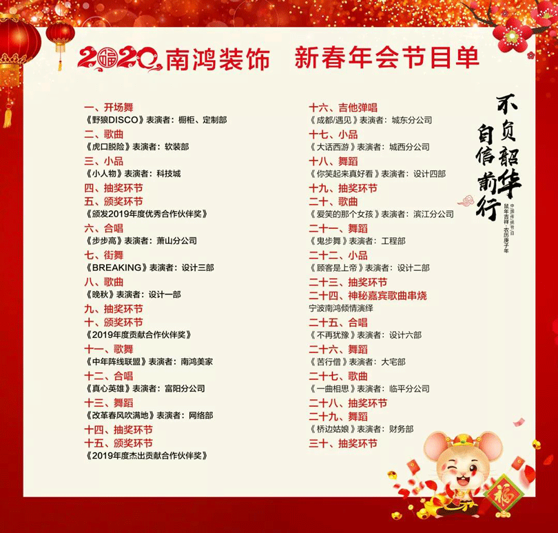 1月16日,主題為“不負(fù)韶華,自信前行”的南鴻裝飾2019年度表彰大會(huì)暨文藝晚會(huì)在杭州杭州寶盛道谷酒店隆重舉行。