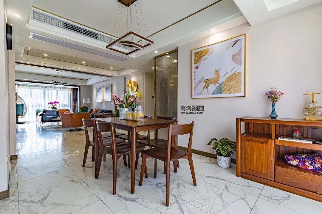 戶 型 圖 設計說明: · 玄關口的次臥門改動,側面做了鞋柜; · 餐廳與客廳均包進陽臺,擴大使用面積; · 改動客衛墻使餐廳開間增大,衛生間做干濕分離; · 原結構圖中的一間書房一分為二,做了主臥的走入式衣庫和北臥的學習區。 入戶過道放置銀色方柜,勾勒金色線條與背景墻、頂面呼應,明黃的花色和虎皮蘭的綠意為家里引入蓬勃的生機。 客廳通鋪大理石地磚,簡單的頂面采用香檳色不銹鋼線條走邊,橙黃+深藍的軟裝色彩搭配令人眼前一亮。 客廳納入陽臺,拓展了使用空間。原木的組合式茶幾與電視柜呼應,大理石的電視背景墻結合木飾面,提升空間質感。 客廳望向餐廳視角,內外通透,視線流暢。 納入客廳的陽臺空間被打造成休閑區,一旁擺放了花盆架,儼然是一處消解疲憊、享受愜意的清新小花園。 餐廳,黑胡桃木的餐桌椅溫潤質樸,展現出低調的姿態,墻上一幅簡框畫營造出溫馨輕松的就餐氛圍。 泡一杯清涼解暑的檸檬茶,品味生活的獨特滋味。 廚房,白色瓷磚搭配深灰色木質櫥柜門,內嵌現代廚電和雙門冰箱為屋主每日下廚提供便利。 臥室色彩柔和,灰紫色的硬包背景不加過多修飾,藍粉搭配的窗簾為房間注入清爽氣息,明亮光線帶來整室的溫暖。 客衛干區,區別于以往的硬墻式隔斷,設計師使用不銹鋼配夾絹玻璃的隔斷形式,令這方空間增色不少。高顏值臺上盆搭配圓框鏡,更顯時尚。 衛生間內,木質臺盆柜組合黑色五金件,簡單利落,鏡柜設計了收納格方便日常使用。淋浴區專門開鑿了壁龕,增加儲物空間。 | 地址:沾橋新苑 | 面積:160㎡ | 風格:現代輕奢 | 設計施工:浙江南鴻裝飾