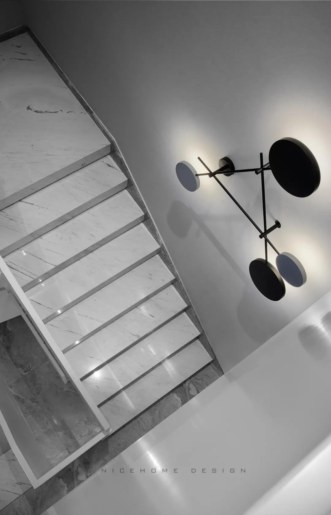 一層原結(jié)構(gòu)樓梯位置不合理,處于入戶正對(duì)口,現(xiàn)移動(dòng)至西側(cè)以規(guī)避缺陷。客廳主沙發(fā)后做一面凌空隔斷墻,增加視覺層次與進(jìn)門后的儀式感。