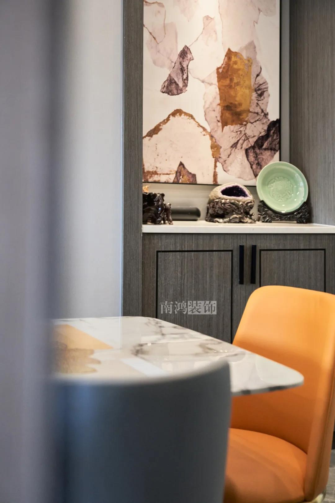 本案的主材有大理石,木飾面,金屬,絨布,皮革等,整體大氣美觀,黑白灰中點綴有寶藍、愛馬仕橙等個性色彩,質感細節融匯于整個空間。