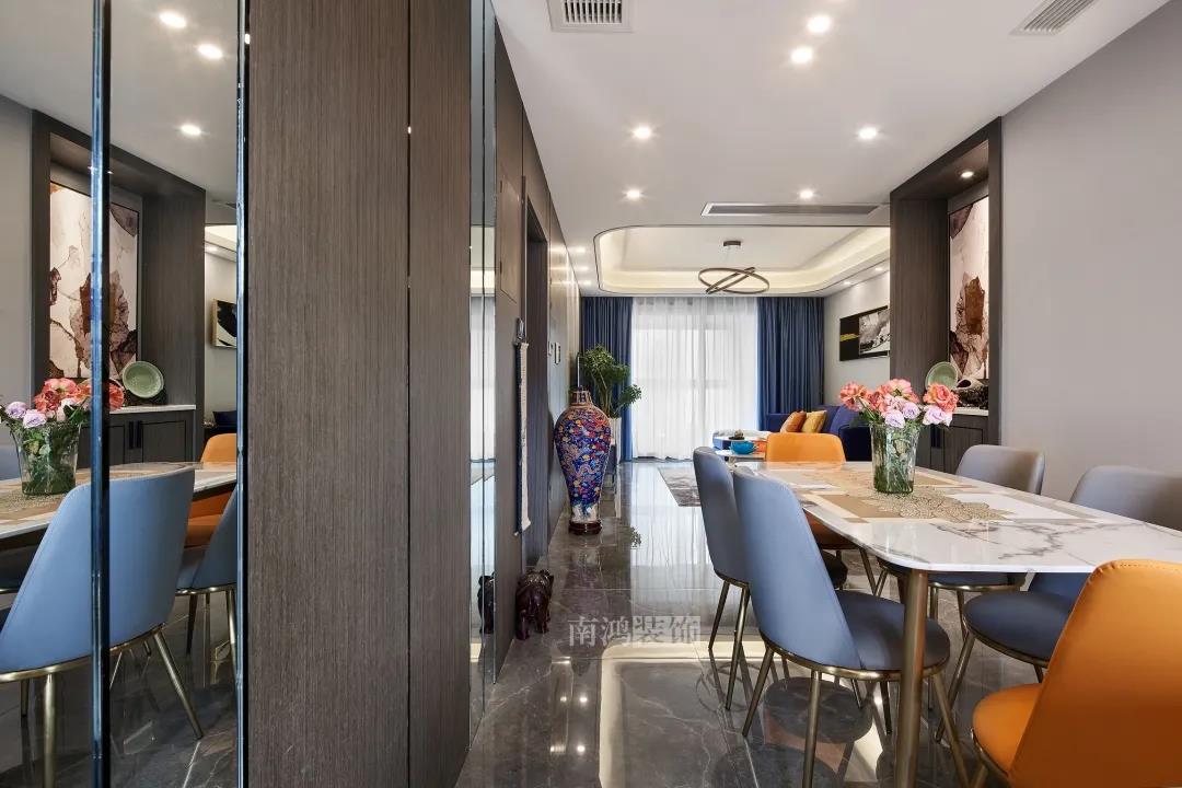 空間內的輕奢精致與現代的簡約美感結合得恰到好處,吊頂一路鋪展至餐廳,南北連貫性極好。