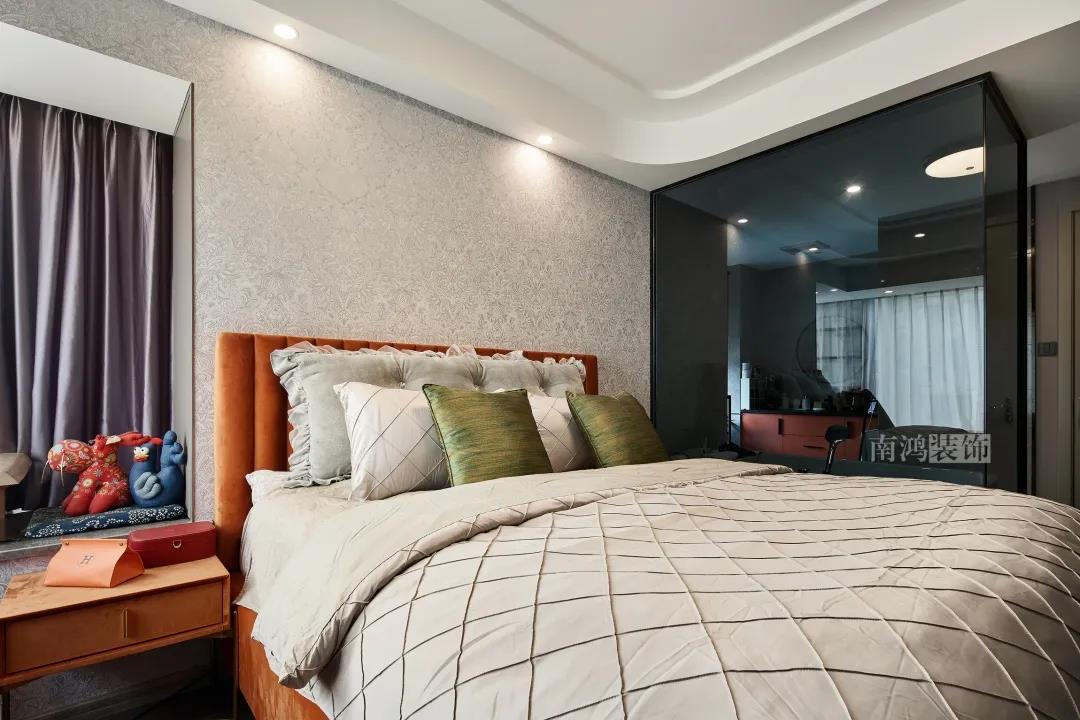 主臥背景墻應屋主的喜好選用了淺色的藝術墻紙,沿窗打造休閑飄窗,床尾則是整排的定制柜體用作日常收納。主衛與睡眠區之間以玻璃相隔,改善了暗衛采光。