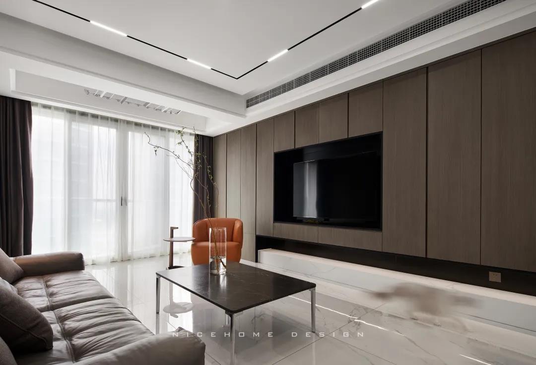 電視背景墻做整面的柜體,地臺取代電視柜的位置,與上方柜體拉開一定距離,削減了一定厚重感。茶幾臺面選擇巖板材質,四四方方的造型含規整有序之意。