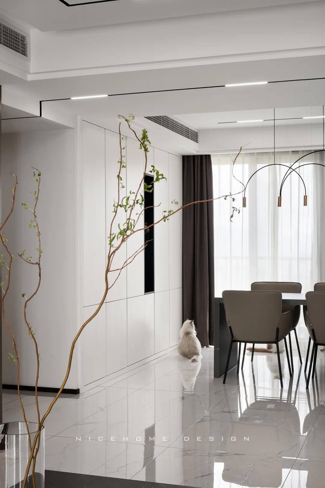 餐廚空間進行重新規劃后,餐廳與西廚合為一體,兩側白色高柜充分利用空間,把收納效率提到極致,極簡銑槽柜門無把手,讓視覺保持統一干凈。