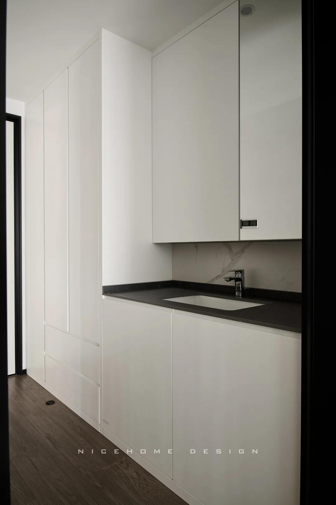 步入主臥,過道一側將衛生間干區與收納柜結合,類似酒店式的布局,干凈清爽。操作臺面周圍做擋水條,可以很好地防止濺水。