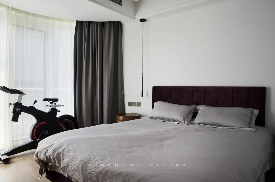 主臥內部利用陽臺拓展使用空間與視覺深度,同時讓更多的自然光線進入房間。背景墻留白,絳紫色絨布床頭詮釋著優雅,陽臺處擺放主人的健身器械方便早起運動。